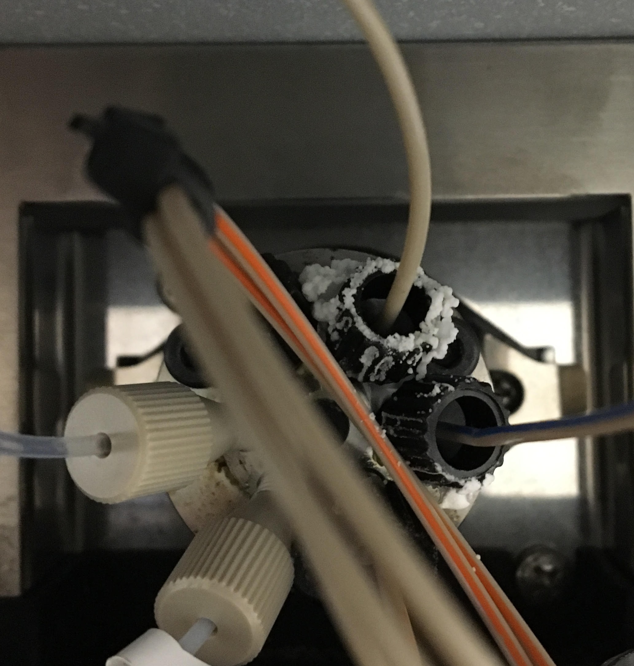 To clean the fitting, salts can be dissolved with DI water. Salt formation can lead to permanently damaged parts by corrosion. Any corroded parts should be replaced.